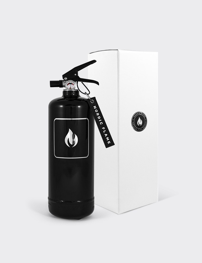Eleganter Feuerlöscher von Nordc Flame in zeitlosem Schwarz mit dem schönen silbermetallischen Emblem, wurde entworfen für stilvolle Wohnumgebungen.